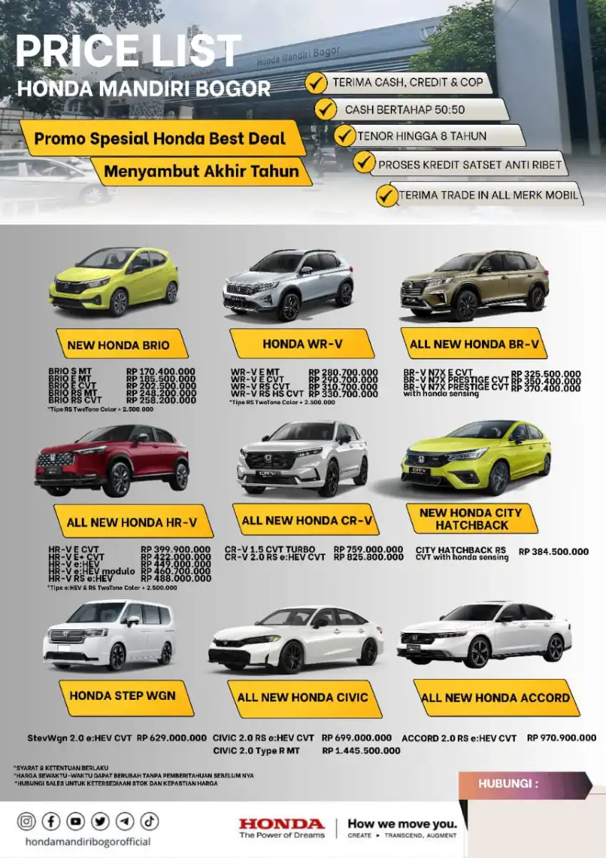 Harga Terbaru Mobil Honda 2025Wilayah: Bogor dan SekitarnyaKeterangan; • Indent Booking Fee Rp. 10.000.000,- • Perbedaan BBN daerah diluar tanggung jawab dealer • Harga Kendaraan tidak mengikat, sewaktu-waktu dapat berubah • Melayani pembelian Cash/Credit, Proses mudah dan cepat